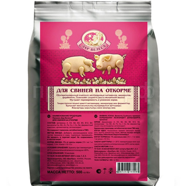 Дозировка: 10 г на 1 кг корма (100 г на 10 кг корма) или 1% от массы корма.